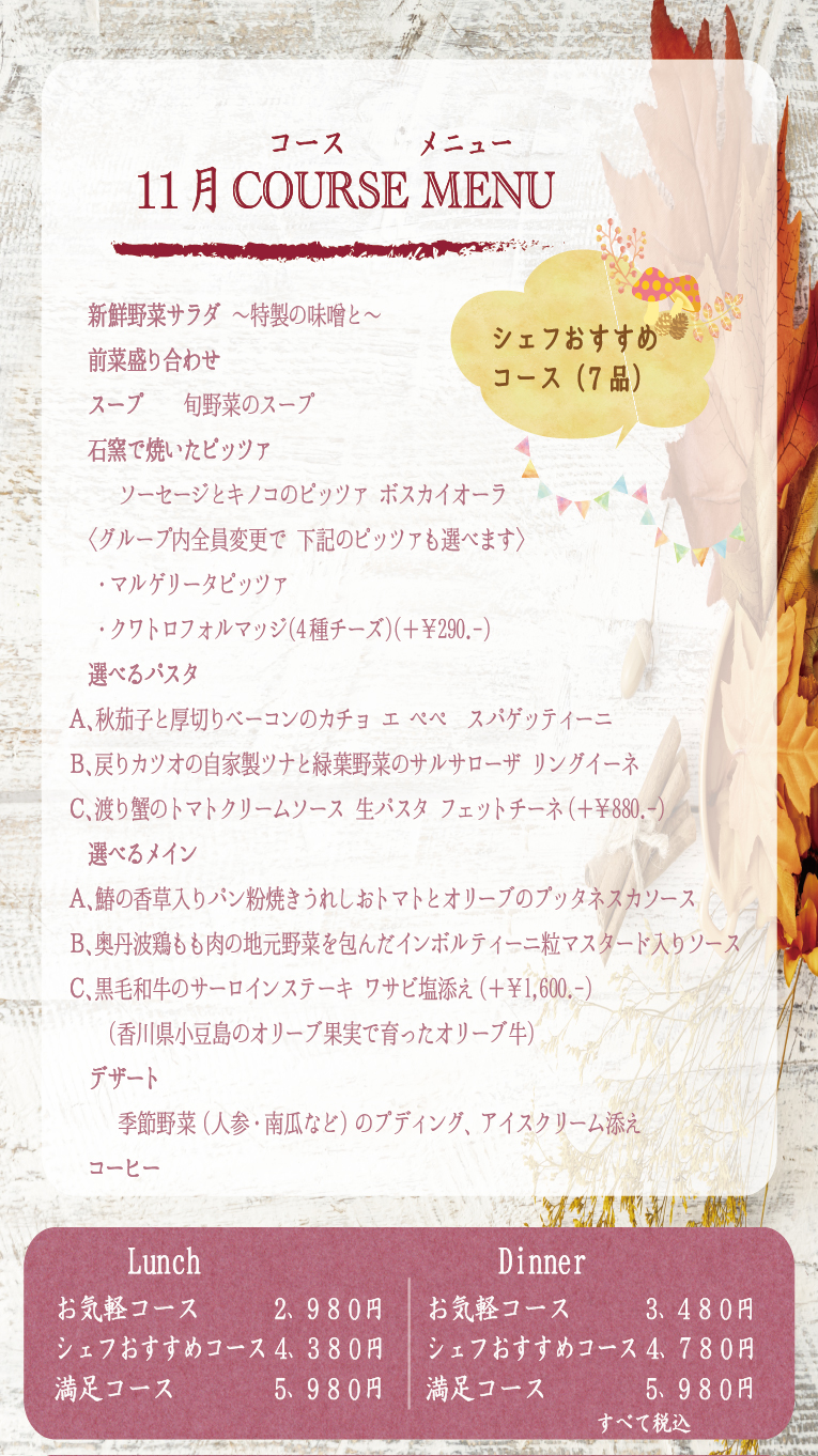 仁木家TOP > 仁木家 イタリア料理 > メニュー(イタリアン) > 11月のイタリアン メニュー @西宮市山口町 2025年10月30日 秋の味覚をぎゅっと詰め込んだ仁木家の11月メニュー🍄香ばしい“森のピッツァ”や、濃厚な渡り蟹パスタ🦀、香草香る鰆のパン粉焼きなど…。心も体も温まるひと皿をお楽しみください🍽️ 仁木家 #西宮イタリアン #秋の味覚 #ボスカイオーラ #カチ。 ← 前へ 次へ →