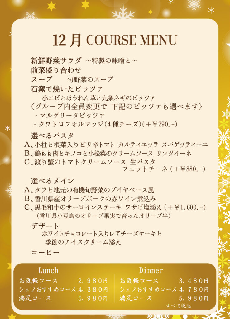 12月限定メニュー #冬のイタリアン #石窯ピッツァ #季節のパスタ #赤ワイン煮込み #ブイヤベース