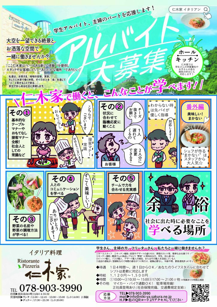 | 勤務地 | 仁木家 Ristrante Pizzeria イタリア料理 兵庫県西宮市山口町上山口4-16-32 仁木家 蕎麦とフレンチ 兵庫県三田市下田中753-1 |